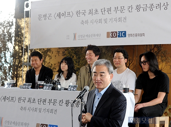 한국 최초 '제66회 칸영화제 단편경쟁부문 황금종려상'을 수상한 문병곤 감독의 영화 '세이프' 축하시사회 및 기자회견이 열렸다. 유진룡 문화체육관광부 장관이 축사를 하고 있다.