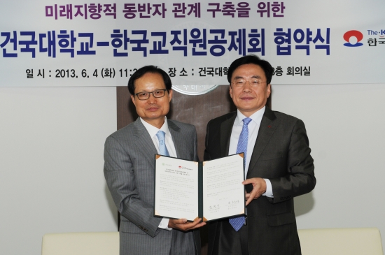 한국교직원공제회(이사장 김정기)와 건국대학교가 4일 미래지향적 동반자 관계 구축을 위한 협약을 체결했다.