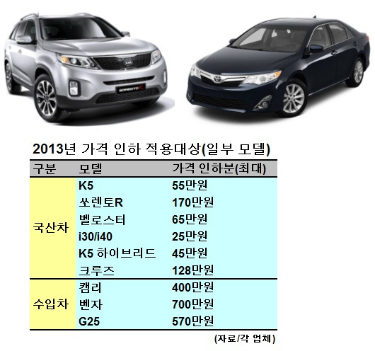 현대·기아차는 상반기 내놓은 투싼ix, 쏘렌토R, K9, K5 하이브리드 등 연식 변경 모델의 가격 인상을 줄이거나 일부 트림은 몸값을 낮췄다. 경기 불황에 내수 부진이 이어지자 차값 할인 전략을 고수하고 있다. 2014년형 쏘렌토R은 주력 트림인 리미티드를 '프레스티지'로 바꾸면서 170만원을 인하했다. 현재 사전계약을 받고 있는 K5 부분변경 모델의 가격은 최대 55만원(터보) 낮췄다.