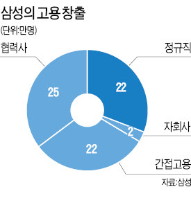 또 수천여개에 달하는 국내 협력사들이 25만명을 채용 중이며 외주인력과 보험모집인, 물류센터 등에서 일하는 간접고용인력이 22만명으로 집계됐다. 협력사 고용인력은 협력사의 모든 임직원이 아니라 삼성 관련 매출을 따져 해당 임직원만 파악하는 방식으로 산정했다. 고용인력 산정에서 해외 사업장에서 일하는 20여만명의 직원은 모두 뺐다.