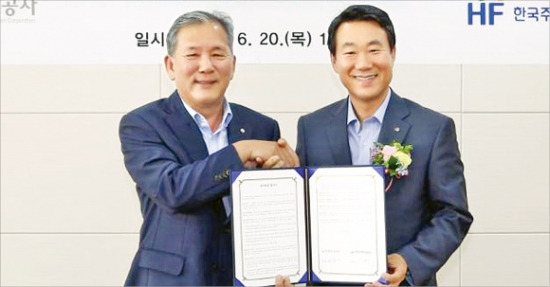 서종대 주택금융공사 사장(오른쪽)과 오두진 인천도시공사 사장은 20일 서민 주거안정 지원을 위한 업무제휴 협약을 체결했다. 주택금융공사는 인천도시공사가 공급하는 주택에 대해 전세자금보증 수수료를 60%, 중도금보증 수수료를 25%씩 할인해 주기로 했다.
