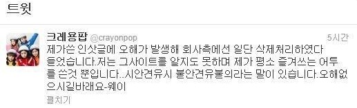 또한 크레용팝의 웨이가 공식 트위터에 "제가 쓴 인삿글에 오해가 발생해 회사 측에선 일단 삭제 처리하였다 들었습니다. 저는 그 사이트를 알지도 못하며 제가 평소 즐겨 쓰는 어투를 쓴 것 뿐입니다.. 시안견유시 불안견유불의라는 말이 있습니다. 오해 없으시길 바래요"라고 입장을 밝히면서 누리꾼들의 분노가 더욱더 치솟게 되었다.
