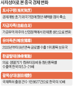 전경련은 세 번째 사자성어로 ‘유아독존(唯我獨尊)’을 들었다. 중국은 2002년까지만 해도 미국, 독일에 이어 전 세계 수출 1위 품목을 세 번째로 많이 보유한 나라였다. 그러나 2004년 미국을 추월했고 2005년엔 독일을 넘어서 지금까지 9년째 수출 1위 품목 최다 보유국가로 자리잡았다. 값싼 상품만 수출하는 건 아니다. 2011년 중국의 사무회계·컴퓨터장비 수출액은 1853억달러로 한국(88억달러)보다 21배가 많았다. ‘환골탈태(換骨奪胎)’란 사자성어가 어울릴 만한 중국 경제의 변화다.