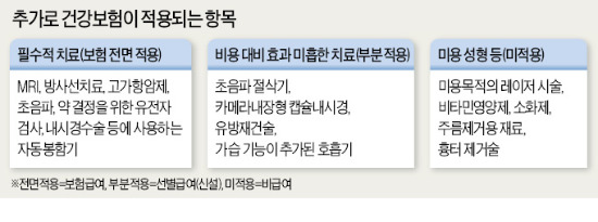 복지부가 선별급여 체계를 들고 나온 데는 새로운 기술이 적용된 의료 행위와 약제, 의료기자재 등을 장기적으로 모두 보험체계로 끌어들이겠다는 복안도 깔려 있다. 복지부 관계자는 “현재 건강보험 적용이 안 되는 항목은 1000여개로 건강보험을 국민들이 모두 참여하는 보편적 사회보험 형태로 운영하는 나라들 중 가장 많은 편에 속한다”며 “궁극적으로 미용 등 의료 목적이 아닌 항목을 제외하고 모두 보험체계에 넣어 관리하는 것이 목표”라고 말했다.