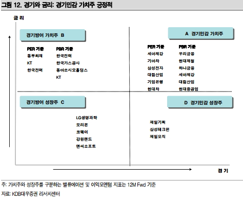 이원선 KDB대우증권 연구원은 "향후 1년간 금리는 상승하는 경향을 보일 가능성이 높다는 점 등에 비춰 이달 대형 경기민감 가치주의 선전이 기대된다"며 "특히 한국은 저성장이 지속되면서 선진국과 같이 할인율(K)에 민감한 시장이란 측면에서도 가치주 강세가 예상된다"고 밝혔다.