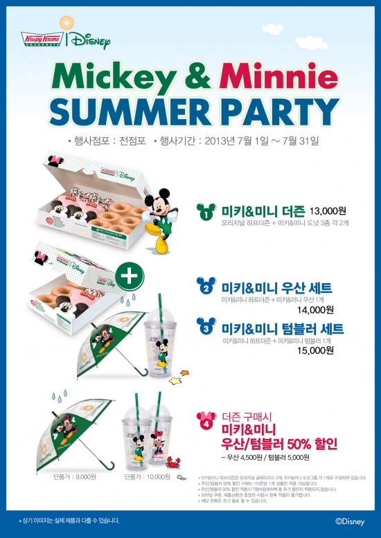 ‘미키&미니 썸머파티’ 프로모션은 오리지널 글레이즈드 구매 시 ‘미키&미니 우산’과 ‘미키&미니 텀블러’를 각 50% 할인된 4500원, 5000원에 구매할 수 있는 프로모션이다.