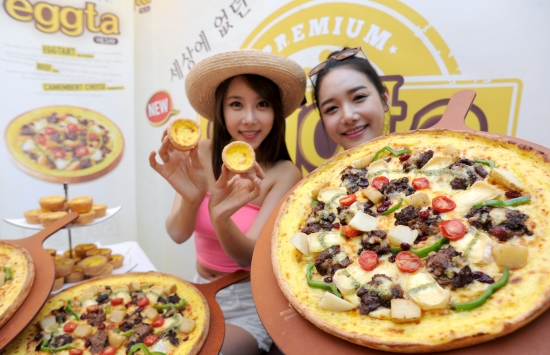 미스터피자는 3일 서울 중구 청계광장점에서 신제품 '에그타 피자'를 출시해 모델들이 제품을 선보이고 있다. 에그타 피자는 쇠고기 스테이크의 맛과 에그 타르트의 식감을 느낄 수 있으며, 식재료 본연의 맛을 강조해 담백하면서 고소한 맛을 제공하는게 특징이라는 업체의 설명이다.