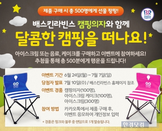 이번 행사에서는 배스킨라빈스 패밀리 사이즈(1만9500원) 이상 구매시 캠핑의자를 2000원에 살 수 있다. 배스킨라빈스 캠핑의자는 핑크, 블루의 2가지 색상으로 귀여운 디자인이 특징인 접이식 의자다. 캠핑, 피크닉 등 가족들이 함께하는 야외 활동 시에 편리하게 사용할 수 있다. 프로모션 행사는 캠핑의자 소진시 까지 진행된다.