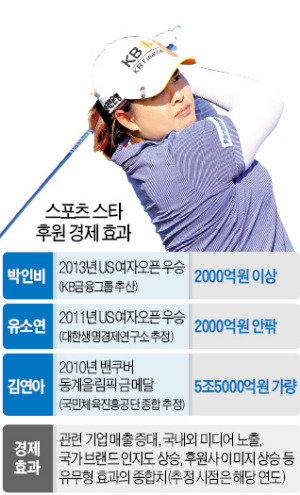 박인비에 대한 투자 대비 효과는 상상 이상이다. 박인비가 메인 스폰서 계약으로 KB금융그룹으로부터 지원받는 금액은 연간 계약금 3억5000만원, 인센티브 최대 5억원, 훈련 지원비 등을 포함해 10억원 안팎으로 알려졌다. 2000억원 이상 홍보 효과가 발생한다면 투자 대비 효과가 200배 이상인 셈이다.