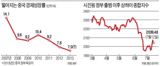러우 부장이 이날 “중국 경제구조를 바꾸기 위해 성장률 둔화는 필수적”이라고 말한 것도 주목할 만한 대목이다. 3월 시진핑 국가주석이 취임한 뒤 중국 정부는 경제 부문에서 강한 개혁드라이브를 걸어왔다. 세계 최대 태양광 업체이자 국유기업인 선텍이 파산하도록 내버려뒀고, 세계 증시에 큰 충격을 안겨주면서까지 시중 유동성을 거둬들여 ‘그림자 금융’을 잡으려고 노력했다. 중국 학계에서는 리커창 국무원 총리가 최근 부양책에 의존하지 않고 작은 정부와 규제 완화 등을 추구하는 공급주의 경제학을 선택했다는 분석도 나왔다. 중국 정부가 하반기 추가적인 부양책을 내놓지 않고 구조개혁을 지속할 것임을 예상할 수 있는 대목이다.