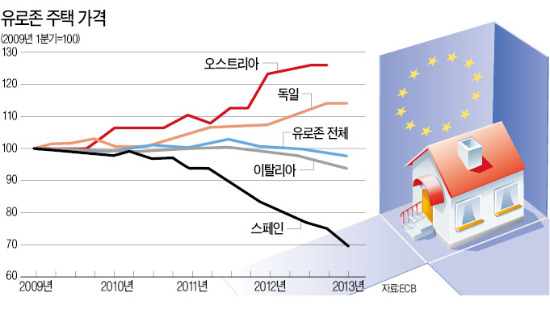 유로존의 상황은 심각하다. 유럽중앙은행(ECB)이 집계한 지난 1분기 유로존의 신규·기존 주택 가격 지수는 2009년 1분기를 100으로 했을 때 96.33을 기록했다. 2006년 2분기 이후 최저치다.