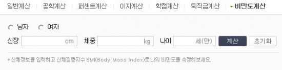 비만도 계산기에 성별, 신장, 체중, 나이를 입력하면 신체질량지수인 BMI(Body Mass Index)에 근거해 비만도를 알려준다.