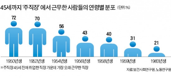 그러나 1997년 외환위기가 이들의 근로생애 후반부를 비극으로 바꿔 놓았다는 게 신 교수의 분석이다. 그는 일생에서 가장 중요한 일터인 주직장에서 45세까지 근무한 확률을 계산했다. 남성을 기준으로 하면 1930년생부터 1950년생까지는 70~80% 수준이었다. 하지만 이후 급속히 하락세를 보여 1955년생부터 1957년생까지는 40%대로 내려앉았다. 베이비붐 세대의 맏형 격인 1958년생의 확률은 40%였다. 급기야 1959년생은 30%대 초반, 1960년생은 20%대 초반으로 추락했다.