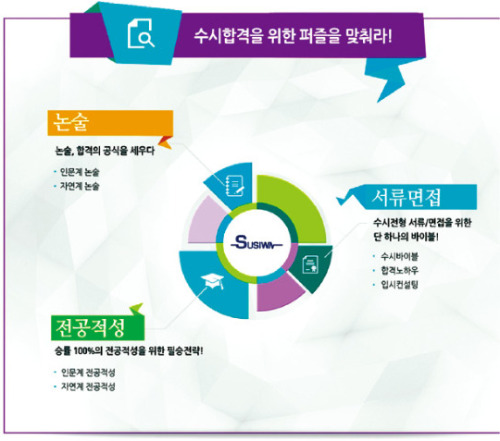 수시와는 수시전형에 초점을 맞춘 만큼 크게 논술, 전공적성, 서류면접 등 3개 영역으로 구성돼 있다. 대학입시를 준비하는 고교 3학년은 물론 저학년인 2학년과 1학년도 미리 준비할 수 있게 돼 있다.