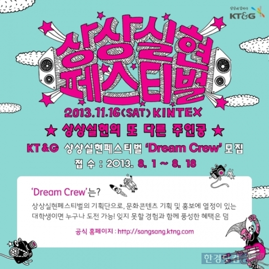 KT&G는 오는 18일까지 '상상실현 페스티벌' 대학생 기획단인 드림크루를 모집한다고 6일 밝혔다.