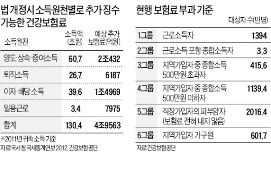 건강보험료를 내지 않는 4000만원 이하 금융소득자, 퇴직·양도소득 및 상속·증여 소득자, 일용근로 소득자에게도 보험료를 부과할 수 있는 법적 근거가 마련됐다. 2011년 기준 이들의 총 수입은 193조원(과세 대상 소득 기준 130조원)에 달한다. 건강보험공단은 이들 소득에 보험료를 모두 부과하면 연간 보험료를 5조원가량 더 걷을 수 있을 것으로 예상하고 있다.