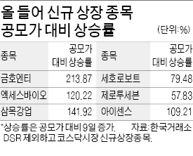 가장 높은 상승률을 보인 종목은 지난 2일 코스닥시장에 신규 상장된 자동차 등 산업용 부직포 생산업체 금호엔티로 나타났다. 공모가 3100원으로 코스닥시장에 입성한 금호엔티는 9일 9730원으로 마감해 6거래일 만에 공모가 대비 213.87%의 수익률을 기록했다. 자동차부품업체 삼목강업(141.92%), 진단시약업체 엑세스바이오(120.22%), 혈당측정기 등 제조업체 아이센스(109.21%)도 상장 후 공모가 대비 100% 이상 수익률을 보였다.
