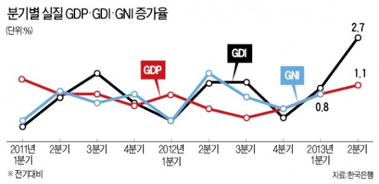 1970년대 고속성장기에는 GDP와 GDI 증가율이 비슷했다. 1980년대에는 연평균 GDI 증가율(9.6%)이 GDP 증가율(8.6%)을 앞질렀지만 1990년대엔 GDP 증가율 6.7%, GDI 증가율 6.0%로 뒤집어졌다. 2000년대 들어 이 격차가 1.1%로 커진 데 이어 2010~2012년에는 1.5%로 더 늘어났다.