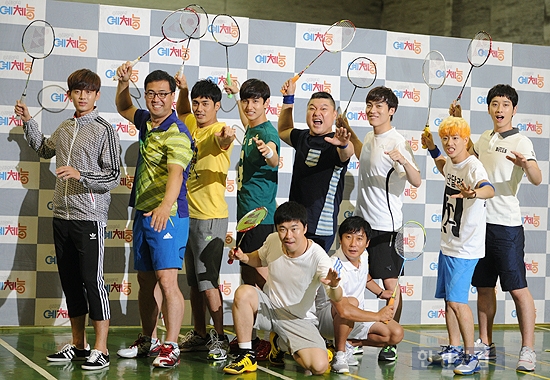 이지훈(윗줄 왼쭉부터 시계방향으로), 이만기, 이종수, 최강창민, 강호동, 존박, 필독, 황찬성, 이수근, 조달환이 14일 오후 서울 화곡동 KBS 스포츠월드에서 열린 KBS 예능 프로그램 '우리동네 예체능' 연습 현장 공개에 참석해 포토타임을 갖고 있다.