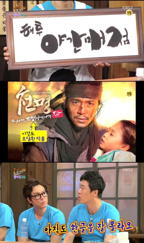 이날 조달환은 야간매점을 위해 '해투야간매점' 현판을 캘리그래피로 직접 써왔다. 아름다운 손글씨를 뜻하는 '캘리그래피'를 자신의 남다른 재능으로 꼽은 조달환은 KBS 드라마 '천명'도 자신이 쓴 글씨라고 밝혔다.