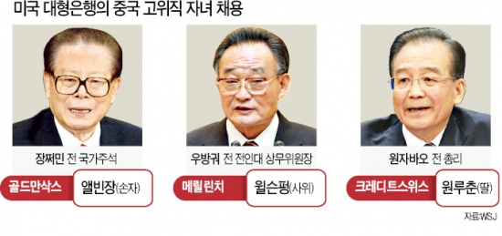 장쩌민 전 중국 국가주석의 손자 앨빈 장은 한때 골드만삭스에서 일했다. 원자바오 전 총리의 딸 원루춘은 크레디트스위스에서, 전국인민대표대회 상무위원장이었던 우방궈의 사위 윌슨 펑은 메릴린치에서 일했다. 메릴린치는 2006년 220억달러 규모였던 중국 공상은행(ICBC)의 기업공개(IPO) 계약을 따내기도 했다. 우방궈의 사위 덕이라는 얘기도 나왔다.