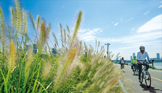 아침이 선선해지는 등 중부지방이 맑은 날씨를 보인 25일 서울 한강변에서 시민들이 수크령꽃이 핀 자전거도로를 달리고 있다. 수크령은 아시아 온대에서 열대지역까지 널리 분포하는 벼과 식물로 8~9월에 꽃이 핀다.