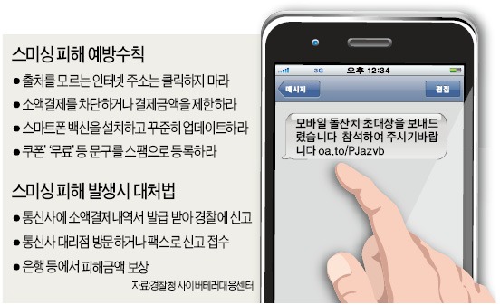윤씨가 겪은 황당한 일은 27일 전국 스마트폰 이용자들에게 뿌려진 ‘돌잔치 스미싱’ 문자로 인해 발생했다. 스미싱은 문자메시지(SMS)와 피싱(phishing)의 합성어로 스마트폰 이용자가 문자메시지에 포함된 인터넷주소를 클릭하면 악성코드가 설치돼 이를 통해 금융정보 등 다양한 개인정보를 빼돌리는 신종 사기 수법이다.