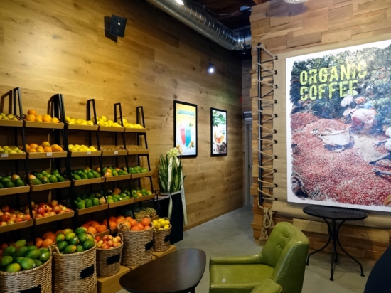 특히 베버리힐스점의 경우 친환경 유기농 카페를 강하게 어필했다는 것. 현지인들의 식음료 트렌드인 유기농(Organic), 자연(Natural), 건강(Healthy)을 고려해 과일과 채소가 들어간 메뉴를 진열해 매장을 꾸민 데다가 대부분 식재료에 미국농부무 유기농 인증(USDA ORGANIC) 마크를 부착, '건강한 주스'로 인정받겠다는 계획이다.