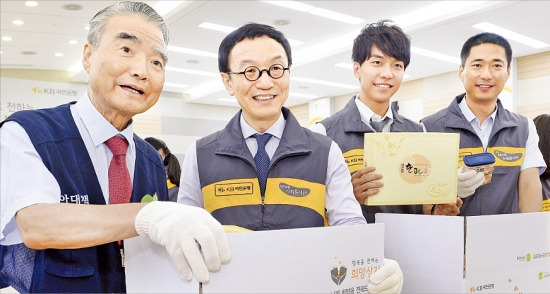 국민은행 임직원과 국제구호단체 기아대책은 4일 서울 여의도 국민은행 본점에서 다문화 가정 1000가구에 전달할 추석 선물을 제작했다. 왼쪽부터 정정섭 기아대책 회장, 이건호 국민은행장, 가수 이승기 씨, 박병권 노조위원장.