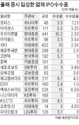 6일 증권정보업체 에프앤가이드에 따르면 올 들어 상장한 17개 기업의 공모액 대비 IPO 수수료율은 평균 3.46%로 집계됐다. ‘최악의 IPO 불황기’로 꼽히는 작년 평균(3.6%)보다도 낮은 수치다.