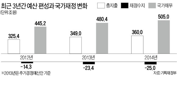 정부는 그러나 내년 실질 성장률 3.9%, 명목성장률 6.5%를 전제로 이 같은 목표를 충족시키는 예산안을 내놨다. 총 지출 증가율을 지난해와 비슷한 5% 수준으로 유지함으로써 경기 대응을 위한 확장형 예산으로 편성하면서도 세출 구조조정을 통해 복지 확대와 일자리 확충이라는 ‘선택과 집중’을 하겠다는 것.
