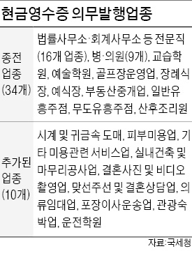 현금영수증을 의무적으로 발급해야 하는 업종이 기존 34개에서 44개로 10개 늘었다. 또 내년 1월부터는 현금영수증 발급 의무 기준이 ‘30만원 이상’에서 ‘10만원 이상’으로 확대된다.국세청은 귀금속 소매업, 피부미용업, 결혼상담업, 포장이사 운송업 등 고액 현금 거래가 많은 10개 업종을 현금영수증 의무발급 업종에 추가했다고 1일 밝혔다. 이는 지난 6월11일 세법 시행령 개정안에 따른 것으로 이날부터 발효됐다.