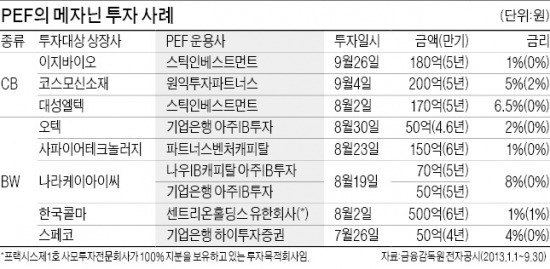 메자닌 투자에 적극적인 PEF 운용사는 스틱인베스트먼트 원익투자파트너스 아주IB투자 기업은행 등이다. 스틱 PEF는 지난 8월 대성엘텍 CB에 170억원을 투자한 데 이어 지난주 이지바이오 CB에 180억원을 투자했다.