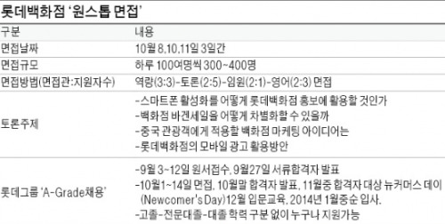 대기업 가운데 발 빠른 채용면접을 실시한 롯데그룹은 14일 롯데홈쇼핑·건설·정보통신·닷컴을 마지막으로 계열사별 면접을 마감했다. 주력 계열사인 롯데백화점의 ‘원스톱 면접’을 통해 대기업 채용면접의 특징을 살펴봤다. 현대자동차그룹은 21일, 삼성그룹은 이달 말부터 면접을 진행할 예정이다.
