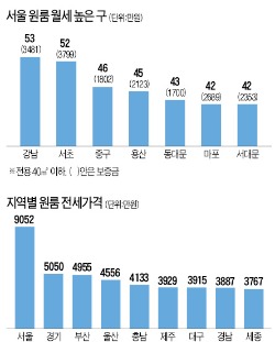 서울에서 월세가 가장 높은 곳은 강남지역이었다. 강남구 월세가 평균 53만원, 서초구가 52만원으로 가장 높았고 중구, 용산구, 동대문구, 마포구, 서대문구 등이 뒤를 이었다. 월세가 높은 강남권, 도심권, 마포·여의도 업무중심지역 주변은 임차 수요가 풍부한 것으로 나타났다. 월세가 낮은 지역은 강북구, 은평구, 성동구, 도봉구 등이었다. 경기도는 광명시, 용인시, 성남시, 김포시, 화성시, 광주시 월세가 평균 33만원 이상으로 높았다. 광명시는 구로가산디지털단지가 인접해서 젊은 직장인 수요가 풍부해 월세가 높은 편이었다.