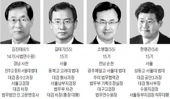 전직·현직 각 2명으로 배치한 것도 내·외부 인사를 망라해 검찰 수장을 뽑아야 하는 비상 상황이란 인식이 반영됐다는 분석이다. 기수로는 14기(김진태)와 15기(길태기·소병철·한명관)로 한정해 검찰 수장의 사법연수원 기수가 지나치게 낮아지지 않도록 했다.