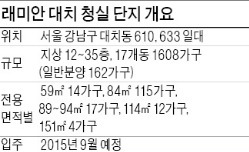 한티근린공원이 단지와 접해 있고 단지 1㎞ 이내에 양재천 산책로, 도곡공원 등이 있어 주거환경이 쾌적한 편이다. 교통여건도 뛰어나다. 지하철 3호선 대치역, 3호선과 분당선 환승역인 도곡역이 단지와 500m 이내에 있다. 남부순환로, 삼성로, 선릉로, 경부고속도로 등 주요 도로 접근성이 좋다. 입주는 2015년 9월 예정이다. 모델하우스는 송파구 문정동 강남 래미안 갤러리 4층에 마련돼 있다. (02)554-5574