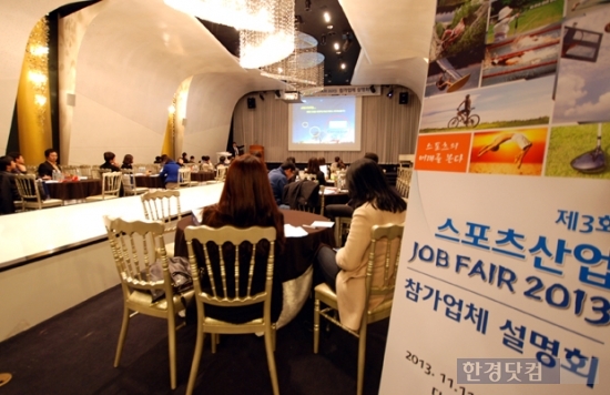 국내 유일의 스포츠산업 전문 일 자리 축제인 '스포츠산업 잡페어 2013' 참가업체 설명회가 11일 중구 중림동 한국경세신문사 18층 다산홀에서 열렸다.이날 행사장에는 주최측인 한국스포츠산업협회 임직원은 물론 참가 예정 기업과 스포츠 관련 유관 기관과 관련 협회 등 50여개 단체의 인사 및 채용 담당자 등이 참여해 성황을 이뤘다.