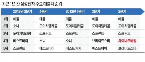 15일 금융감독원 전자공시시스템에 따르면 올 3분기 삼성전자의 주요 매출처 순위에서 차이나모바일이 애플과 도이치텔레콤, 미국 스프린트에 이어 4위를 차지했다. 차이나모바일은 2분기 5위였던 미국 최대 유통업체 베스트바이를 밀어내며 단숨에 4위로 진입했다.