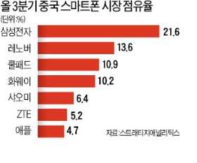 삼성전자는 지난해 중국 휴대폰 시장에서 1위로 올라선 이후 2위와의 격차를 벌려가고 있다. 미국 시장조사업체 스트래티지애널리틱스(SA)에 따르면 삼성전자는 3분기 중국에서 1720만대의 스마트폰을 판매하며 21.6%의 점유율을 기록했다. 2위 레노버와의 점유율도 전분기 5.8%포인트에서 8%포인트로 벌렸다. 애플은 5% 미만의 점유율로 7위에 머물렀다.