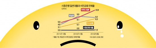 정부와 신용보증기관 등이 대출금의 95~100%를 보증해주는 바꿔드림론과 햇살론은 더 심하다. 지난 9월 말 바꿔드림론의 대위변제율은 13.9%, 햇살론의 대위변제율은 9.2%에 이른다. 대위변제율은 금융회사에서 돈을 빌렸다가 갚지 못해 보증기관이 대신 갚아준 돈의 비율을 뜻한다. 그만큼 대출을 갚지 못하는 서민들이 많아지고 있다는 의미다.