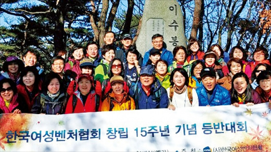 한국여성벤처협회(협회장 이은정)는 지난 16일 경기 과천 청계산에서 ‘창립 15주년 기념 등산대회’를 가졌다. 이날 행사에는 이현재 새누리당 의원, 최문기 미래창조과학부 장관, 한정화 중소기업청장, 이헌재 전 부총리 겸 재정경제부 장관, 이기주 한국인터넷진흥원장, 산악인 오은선 씨 등 100여명이 참가했다. 역대 회장인 이영남 이지디지털 사장, 송혜자 우암닷컴 사장, 배희숙 이나루티앤티 사장, 최정숙 포커스컴퍼니 사장 등도 함께했다. 이 협회장은 “여성벤처인들의 끊임없는 노력과 동반자인 미래부, 중기청 등 유관기관 및 금융권의 관심과 지원으로 이 자리까지 왔다”면서 “앞으로도 더욱 노력해 업계를 빛내는 데 함께 힘을 모으자”고 말했다.