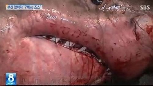 22일 부산 앞바다에서는 조업 중이던 어선 그물에 길이 4m, 무게 700kg 이상의 엄청난 크기의 백상아리 한 마리가 걸렸다.