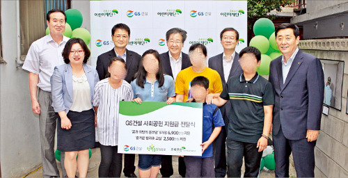 GS건설(회장 허창수)은 기업의 사회적 책임을 다하기 위해 다양한 사회공헌활동을 진행하고 있다. 체계적이고 지속적인 사회공헌활동 정착을 위해 최근 활동 영역을 △사회복지 △교육·문화 △환경·안전 등 3대 영역으로 재편했다.GS건설이 중점을 둔 사업은 저소득층 가정을 대상으로 한 ‘꿈과 희망의 공부방’ 프로그램이다. 이 활동은 저소득층 가정 어린이들을 위한 교육 및 놀이시설을 만들어 주는 프로젝트다. 2011년 5월 1호점을 시작으로 2년여 만인 지난 6월 100호점을 오픈했다. 어린이재단과 공동으로 매년 40명의 청소년을 선정해 공부방 지원 사업을 하고 있다. GS건설 임직원들은 직접 가정을 방문해 공부방을 꾸며주고, 직원들이 청소년·아동의 멘토가 돼 꿈과 희망이 지속될 수 있도록 돕고 있다.