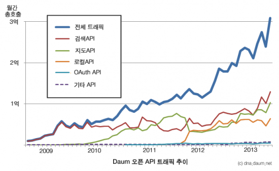 올해부터 다음은 온라인 검색 광고 사업에 진출하면서 검색 광고 상품과 함께 검색 API 서비스를 제공하고 있다. 지도 API의 사용량은 월 1억건을 넘어서며 일 평균 400만회 이상 사용되고 있는 것으로 나타났다. 이는 작년 지도 API의 상업성 사용 기준 완화 이후 사용량이 대폭 늘어간 것으로 매일 5000여개 사이트에서 특정 장소의 약도 및 위치 표시를 위해 지도 API를 사용한다.