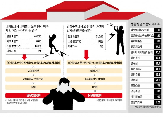 내년부터 오후 10시 이후 아래층에서 느끼기에 진공청소기를 돌리는 정도의 소음을 내며 아이들이 세 번만 뛰어다녀도 월 7만4400원, 연간 89만2800원의 배상액을 지불해야 한다. 또 밤에 망치질을 하는 정도 이상의 소음을 낼 경우에는 배상액이 할증된다. 환경부 중앙환경분쟁조정위원회가 최근 이 같은 내용의 배상액 산정 기준을 처음으로 마련한 데 따른 것이다.