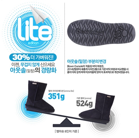 라이트 에디션은 기존의 제품보다 무게를 1/3 정도 감량했다. 지금까지 사용해오던 무게감 있는 러버(고무)재질의 아웃솔(밑창) 대신 경량화 추세에 맞도록 개발된 Blown Rubber 공법의 아웃솔을 적용시켜 가능했다. 베어파우 코리아에서 개발한 아웃솔 재질인 블로운 러버는 기존의 밑창처럼 견고하고, 미끄러움에 강하며, 외부 화학 자극 및 오염물질에 대한 저항성(내환경성)은 그대로 유지했다. 그럼에도 불구하고 가볍고, 쿠션감은 살아있다.