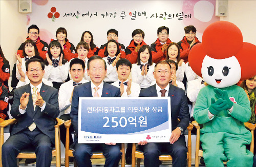 이번에 전달된 성금은 ‘교통안전, 장애인, 문화예술, 다문화 가정’ 등 다양한 분야를 중심으로 소외이웃 및 저소득층 지원을 위해 쓰일 예정이다. 올해 성금 전달을 통해 현대차그룹은 2003년부터 11년간 총 1340억원을 사회복지공동모금회에 기탁했다.