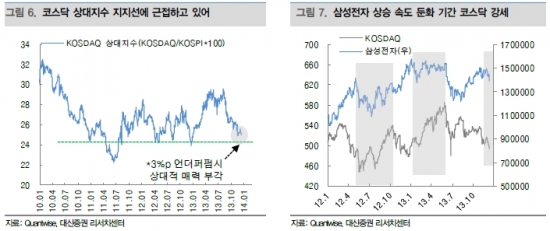 코스피지수 대비 코스닥지수의 매력이 확대되고 있다는 점과 삼성전자의 상승 탄력이 둔화되고 있다는 점도 긍정적이다. 최근 2년 삼성전자 상승 탄력 둔화 기간에 코스닥이 강세를 나타냈기 때문이다.