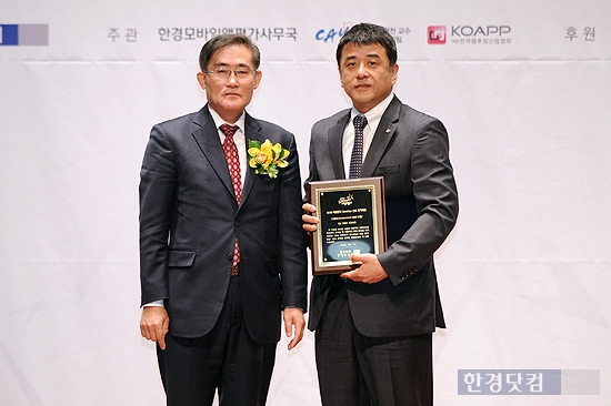 종합평가 부문 디자인/UI 부문 대상을 수상한 CJ CGV(CGV) 윤익준 마케팅실 상무(오른쪽)와 황재활 한경닷컴 사장이 포즈를 취하고 있다.